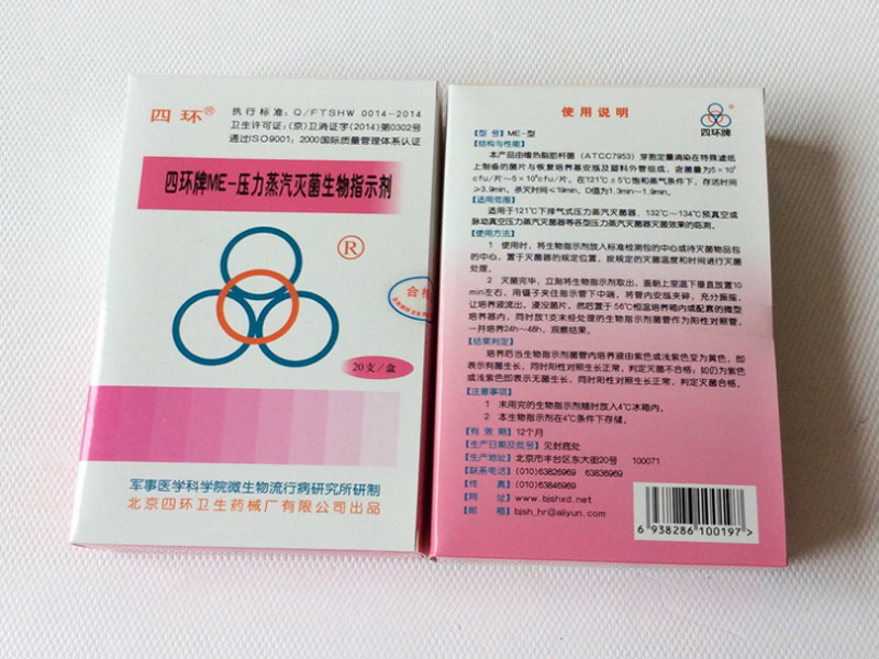 四環(huán)牌ME-型壓力蒸汽滅菌生物指示劑是由嗜熱指肪桿菌(ATCC 7953)芽孢菌片、恢復培養(yǎng)基和外管組成。