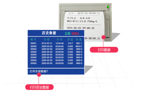 儀器內(nèi)置打印機(jī),可打印當(dāng)前數(shù)據(jù)和所有存儲(chǔ)的歷史數(shù)據(jù)